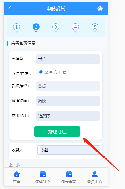 3. 申請打包的時候,第二步,完成包裹信息步驟的時候,可以添加新地址或者選擇已有的地址。
