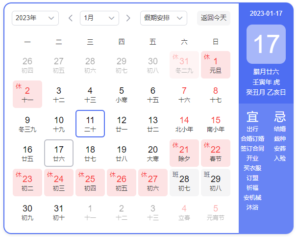 2023年1月17日(周二)放假休息,2023年2月1日(周三)開始恢復上班。