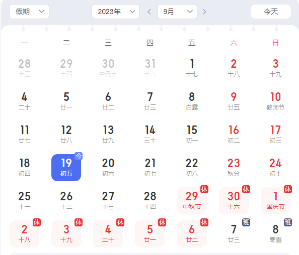 2023年09月29日(周五)放假休息,10月07日(周六)開始恢復(fù)上班。