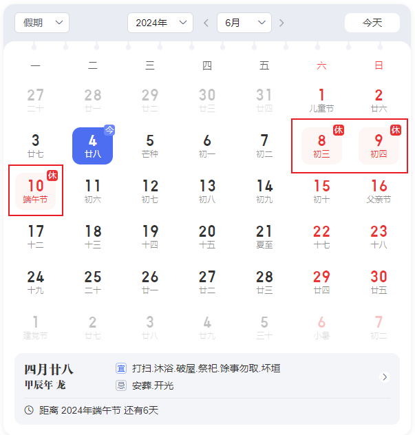 2024年06月08日(周六)放假休息,2024年06月11日(周二)開始恢復上班。