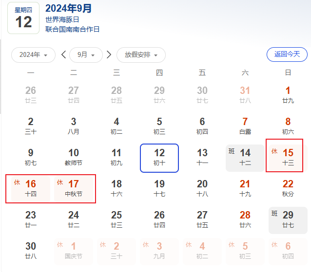 2024年09月15日(周日)放假休息,2024年09月18日(周二)開始恢復(fù)上班.2024年09月14日(周六)補(bǔ)班。