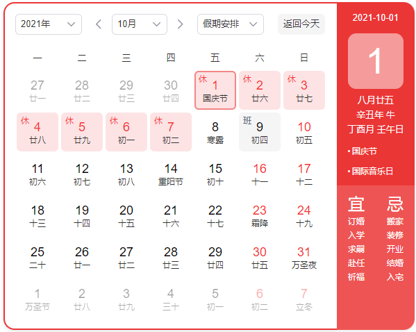2021年10月1日(周五)至10月7日(周四),放假共七天,9月26日(周日)、10月9日(周六)補班,10月8日(周五)上班。