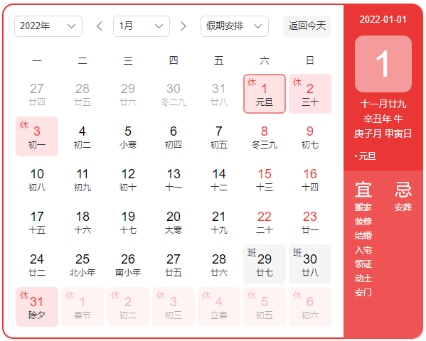 2022年1月1日(周六)至1月3日(周一),放假共三天,1月4日(周二)上班。